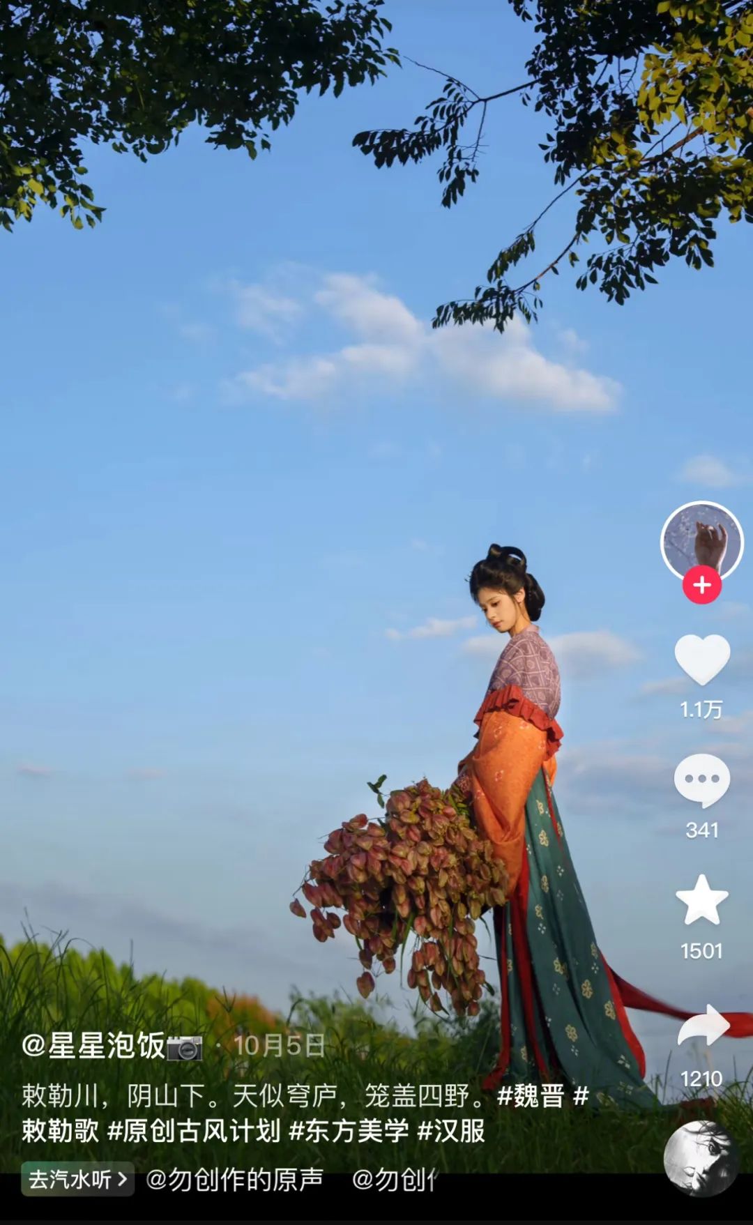 “东汉袍还是要自杀才有宿命感。”评论区有群众发言,博主姐姐马上回应:“这次没有合适的剑,下次一定要自己试试!”
