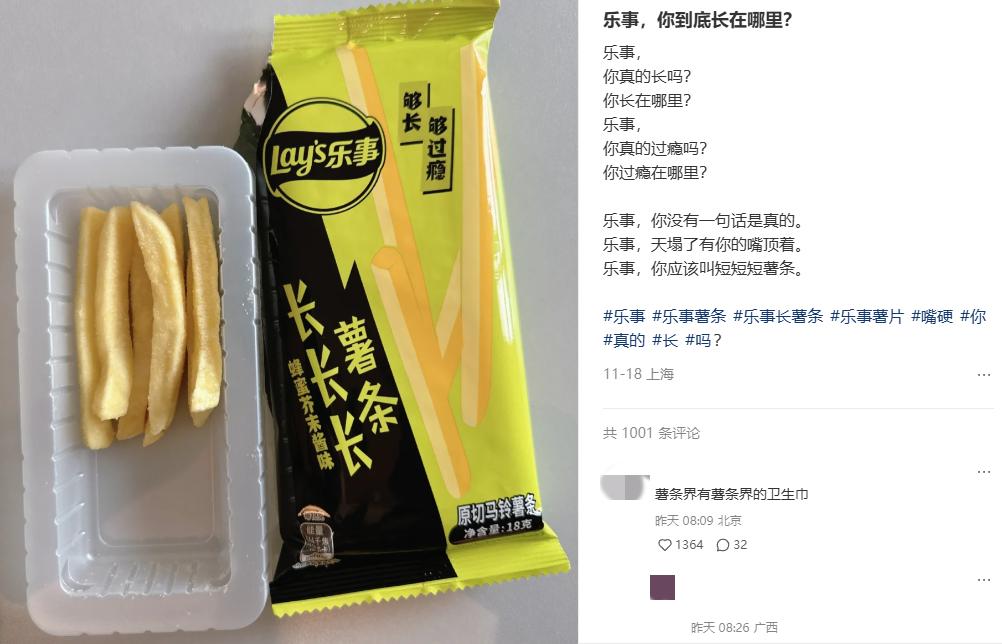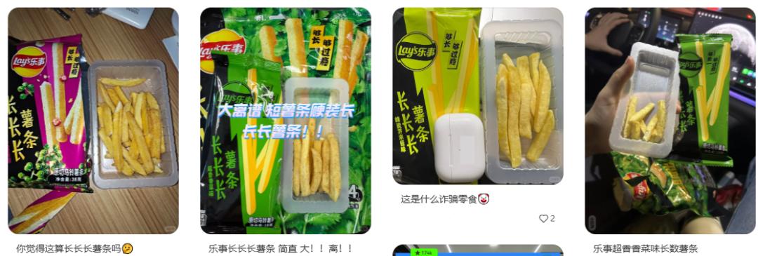 从上个月底找到薯条推荐官papi酱,到最近疯狂投放美食博主,大家都把乐事土豆神吹得天花乱坠,“比我吃过的所有薯条都要长。”,于是大馋丫头和小子们纷纷下单,原本以为在这个寒冷的冬日与土豆仙大家分享超强的生命力,结果拆开后才发现: