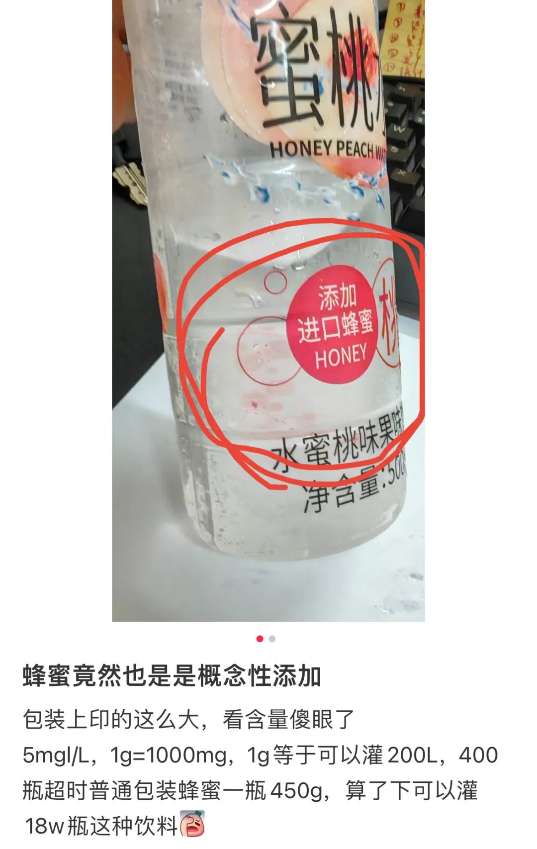 品牌的算盘都快敲到你的脸上了,还有一些品牌爱玩。概念性添加。依能售价4元的1L饮料含有进口蜂蜜,网友一换算发现“5mgl/L,相当于1g等于能灌200L”;龙井新茶说东方8片叶子是5g/L,但是实际上每瓶明前龙井都不清楚被涮了多少次,相当于在太平洋打了一个鸡蛋,却说请全世界喝蛋花汤。。