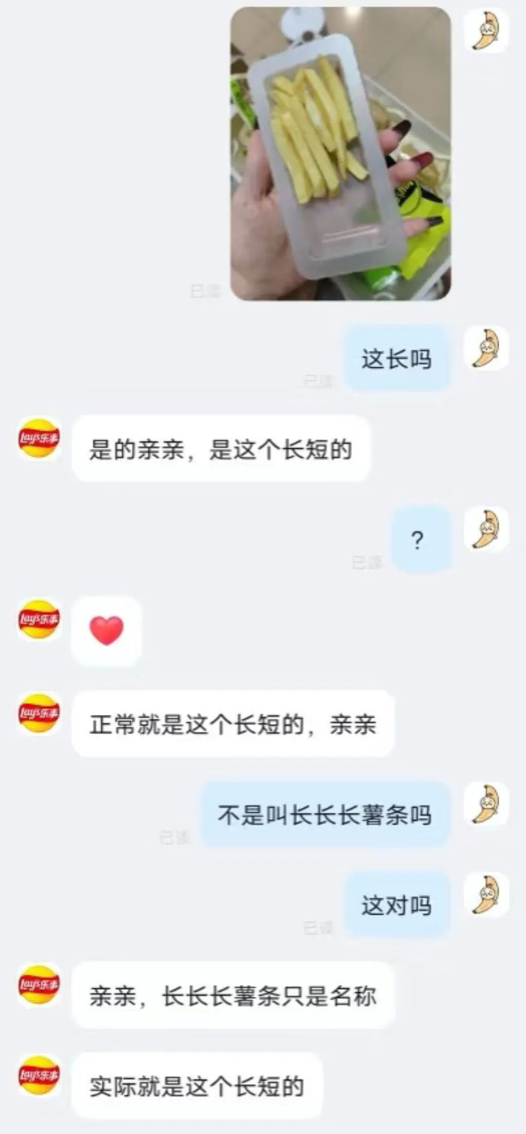所以,无论是土豆没有成长为乐趣的美好想象,还是薯条过筛机的操作失误,还是对长度的认知与我们完全不同。。网民们看着博主们一盒满满的长薯条流口水,带着疑惑向乐事天猫旗舰店官方客服咨询,得到的答案是:“正常情况下是这个长度”。