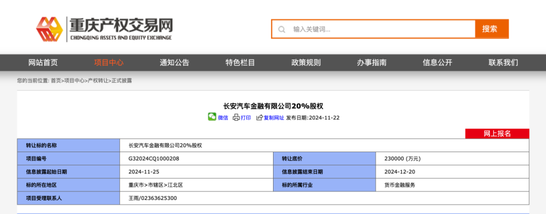 近日,重庆产权交易网发布的产权转让数据显示,长安汽车金融第四大股东拟出让其持有的20%股权,上市底价达到23亿元。