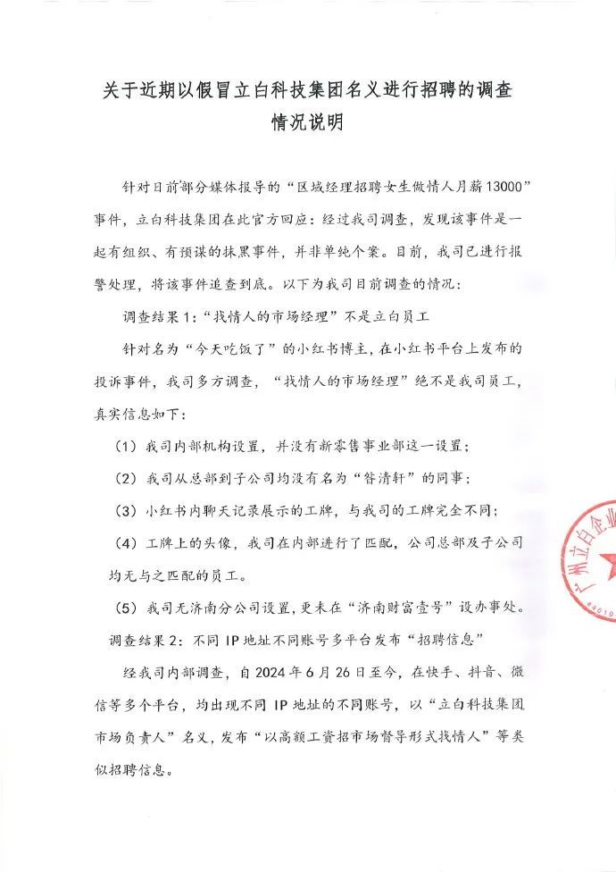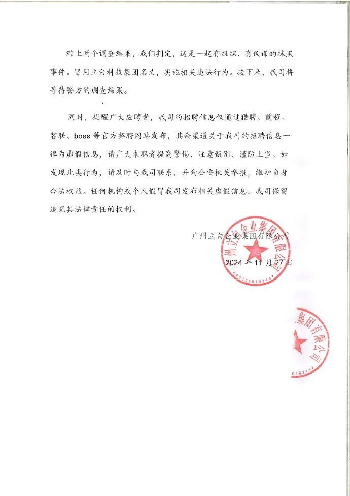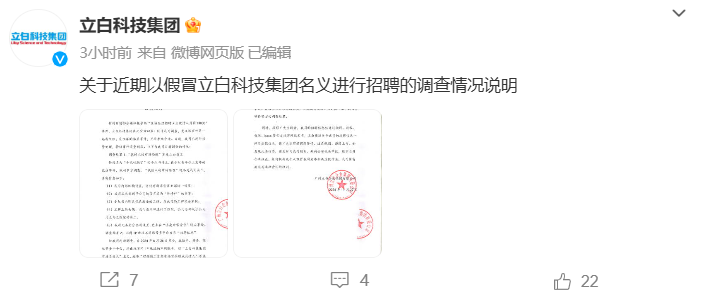立白科技集团还表示,经过公司内部调查,自2024年6月26日以来,不同IP地址的不同账号出现在Aautorapper、Tiktok、微信等多个平台上。以“立白科技集团市场负责人”的名义,发布类似的招聘信息,如“通过高薪招聘市场监管找情人”。立白科技集团提醒广大求职者,公司的招聘信息仅通过猎聘、未来、智联、boss等官方招聘网站发布,其他渠道均为虚假信息。