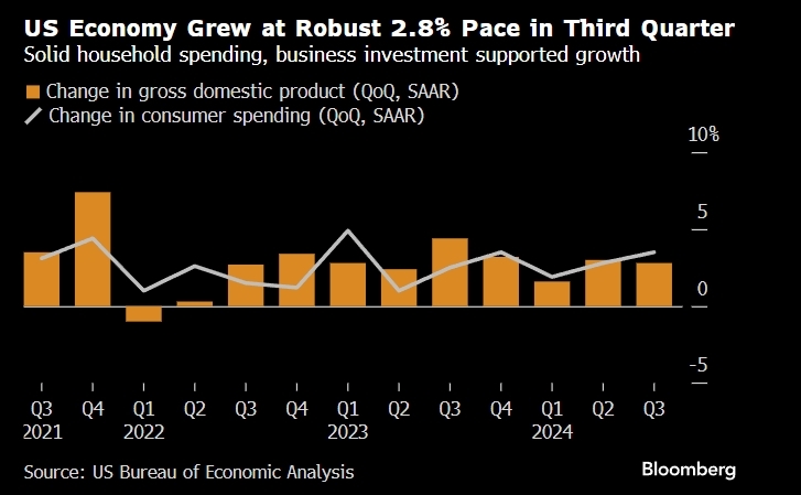 根据美国周三发布的数据,美国第三季度实际GDP年化季度环比修正值为2.8%,符合预期;第三季度核心个人消费支出(PCE)价格指数年化季度环比修正值2.1%,低于预期和初值2.2%。