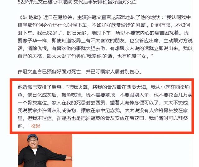 82岁的许冠文还在拍戏,解释后事:墓地又贵又抢手,把自己的骨灰撒进海里。