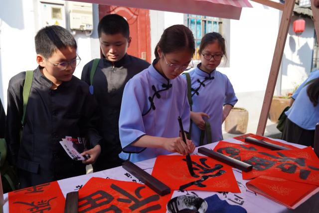 除剧本探案外,家乡文化感受也是一大亮点。同一天,仓桥学校宝葫芦的秘密、蓝色染色、丝绸珐琅、农家塌饼社团,在新邦学校的剪纸、书法、新邦山歌、田八样社团,在钓湾古街摆摊设点。“借助地理优势,将红色文化、家乡文化等思想政治元素融入到剧本研究活动中,提高了思想政治课的趣味性,寓教于乐,引导学生铭记历史,树立热爱家乡、热爱祖国的观念。"仓桥学校副校王德伟说。