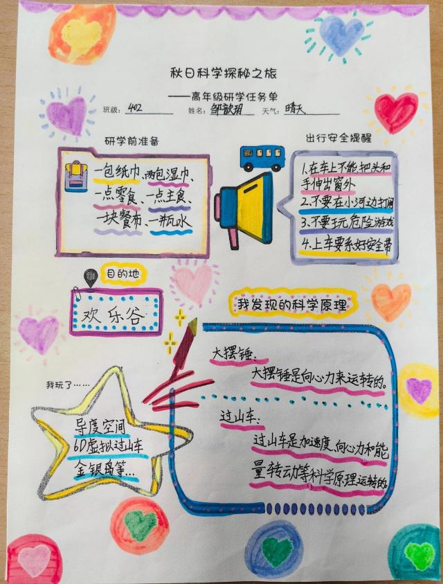“碰碰车为什么不怕碰撞?""为什么过山车会让人感到空虚?""海盗船涉及哪些科学原理?"...去上海欢乐谷玩了一趟,上师大附外小三到五年级的学生带回了一堆问题。每个人分道扬镳,上网查询,找老师和家长回答,十八般武艺全用,生成“科学探秘成果单”。四年级学生蒋奕城在感受到碰碰车、过山车、旋转木马等游乐项目后,好奇的是:“我在玩海盗船的时候,有一种马上就要扔出去的感觉。我想知道为什么海盗船不会把我扔出去。"回家后上网查了一下才知道,原来是因为凝聚力原理,海盗船可以在保证安全的同时给游客带来刺激体验。三年级学生张竣策则发现,在重力和动力的相互作用下,海盗船可以通过摆锤和驾驶舱结构摆动,而齿轮传动可以实现二次减速。