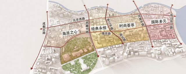 根据规划,同时考虑区域交通组织和贸易资源,以西藏中路、浙江中路-湖北路、河南中路等南北向主干道为界,形成 4 一个空间布局。通过多个重点项目的改造和升级,每个分区都建立了自己的特色,填补了主街的功能,完善了客户的需求,从点到面,辐射区共同构建了一个完整的商业生态场景。