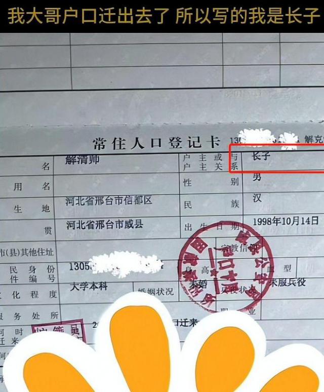不仅如此,解清帅的户籍也和生父母是一本书,还因为大哥已经把户籍迁出去了,自己就成了“长子”。
