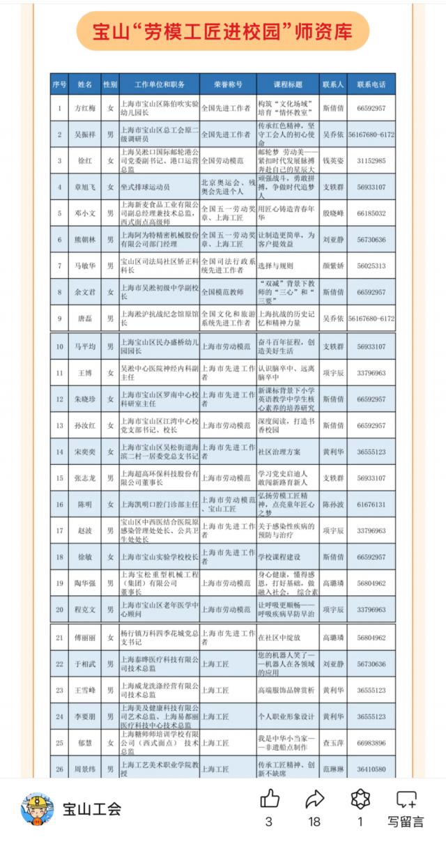 “上海工会重点工作创新案例”在新一期中,“三建、三说、三进”提升“三力”推动“劳模工匠进校园”案例,宝山区总工会。当选!