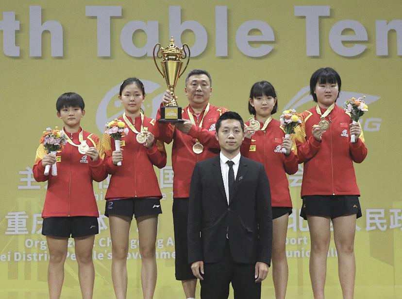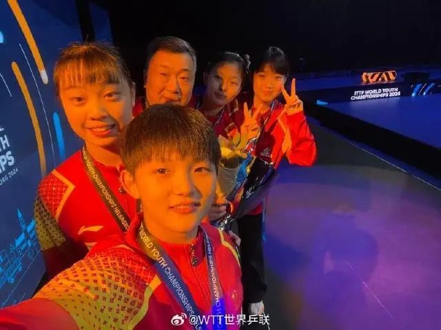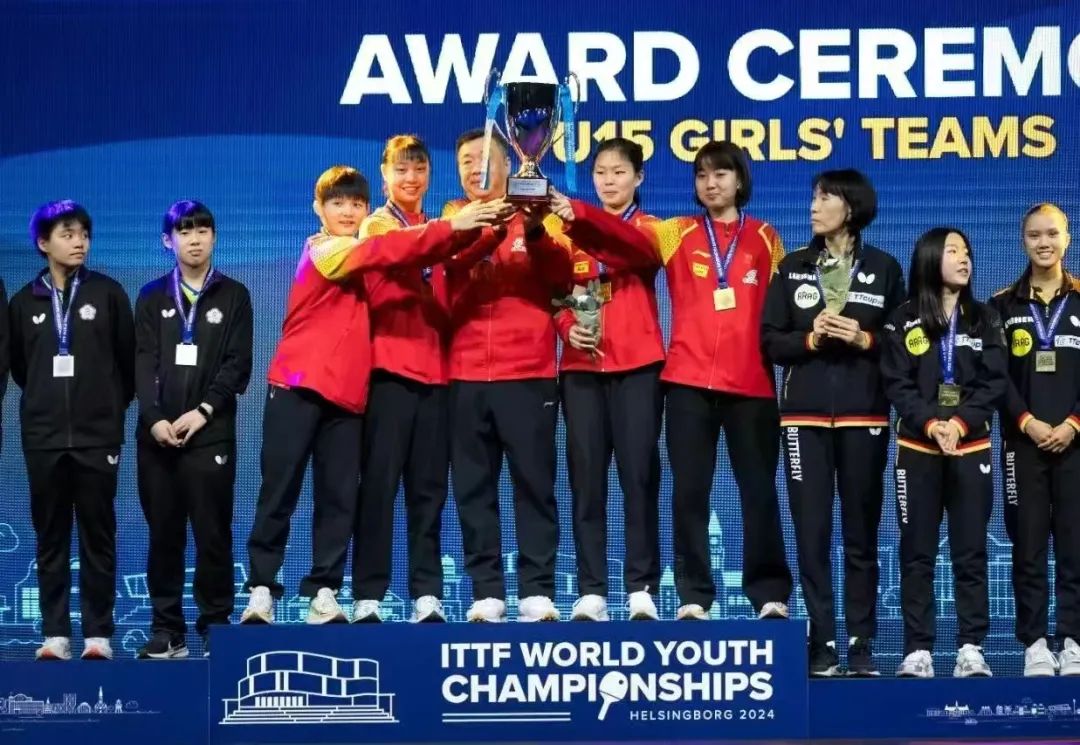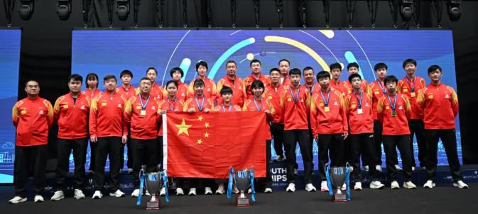 祝启慧在2024年世界青年乒乓球锦标赛上获得团体冠军合影(左三)
