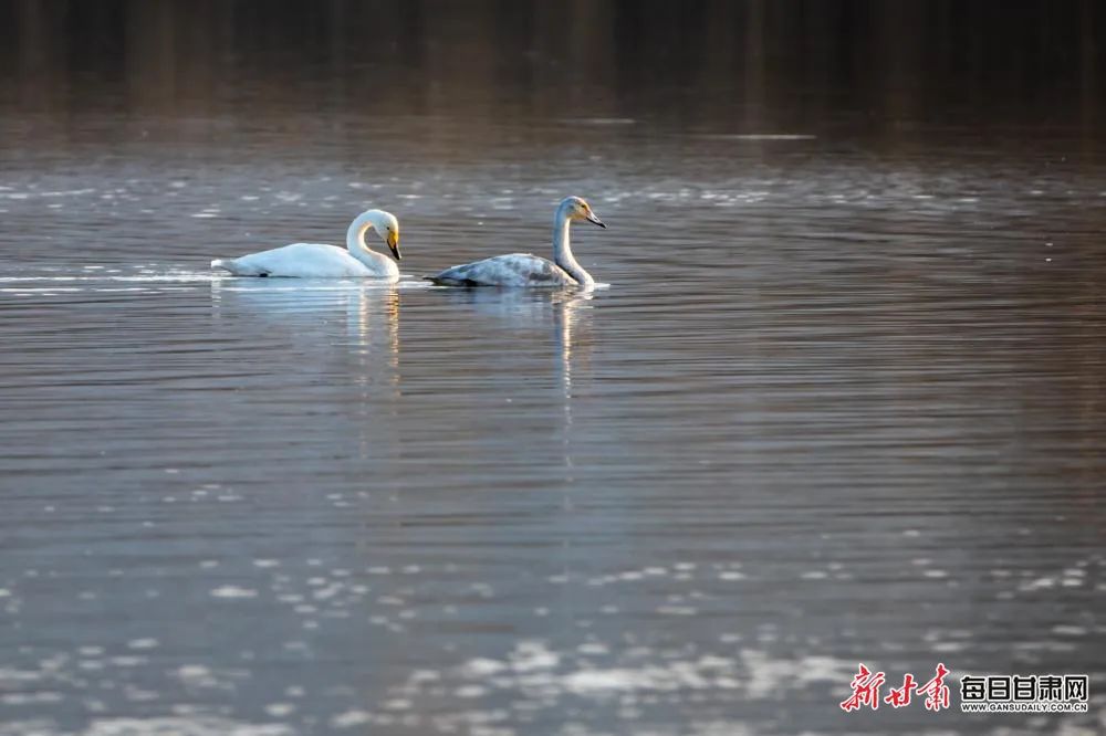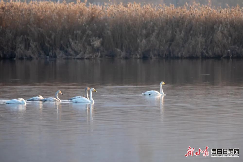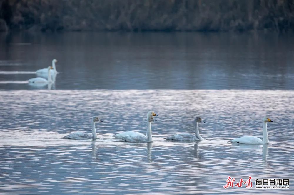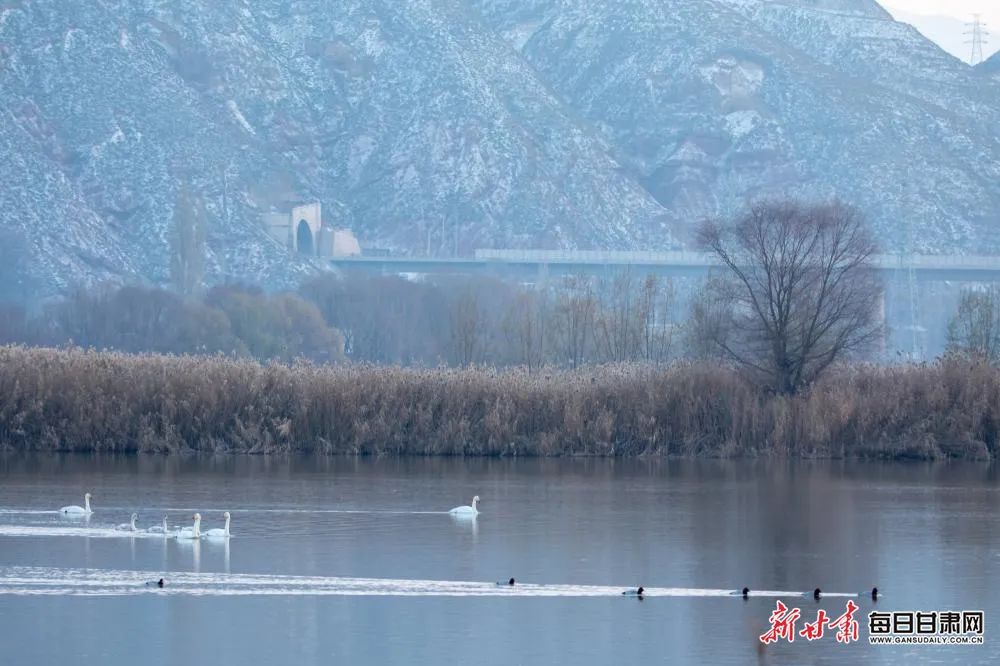 11月26日,位于兰州市西固区达川镇的三江口天鹅滩相继迎来了九只白天鹅在这里过冬。它们的白色羽毛与冬天的黄河水形成了一个美丽的生态轴。