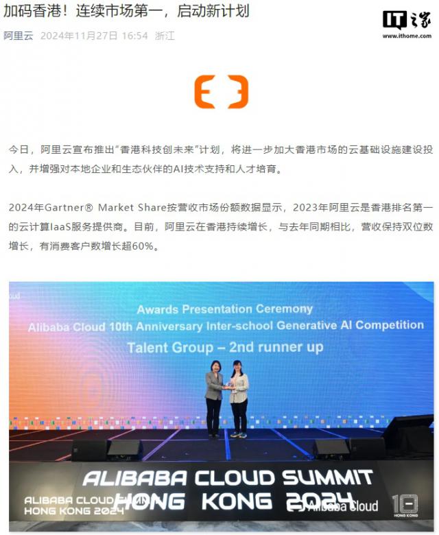 IT 世家 11 月 28 日消息,阿里云于 11 月 27 日本宣布推出“香港科技创造未来”计划,将进一步加大对香港市场云基础设施建设的投入,加强对当地企业和生态合作伙伴的投资。 AI 技术支持和人才培养。