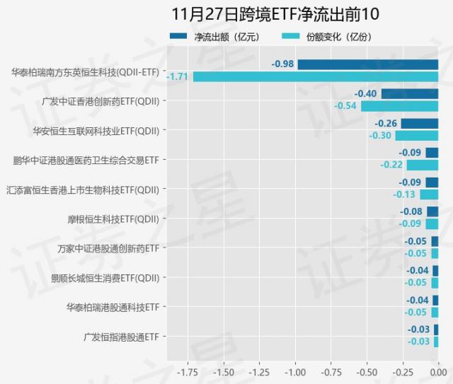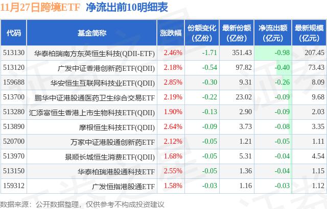 当天有 28 只跨境 ETF 资金净流出,其中华泰柏瑞南方东英恒生科技排名第一。 ( QDII-ETF ) (513130),份额下降 1.71 一亿份,净流出额为 9819.42 万元。
