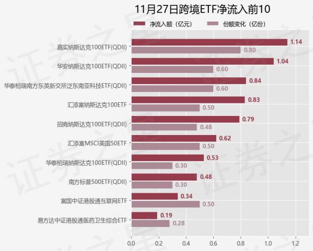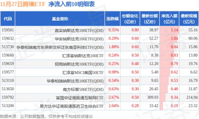 当天有 47 只跨境 ETF 基金出现净资金流入,其中嘉实纳斯达克排名第一。 100ETF ( QDII ) (159501),份额增加 8000.0 万份,净流入额为 1.14 亿元。