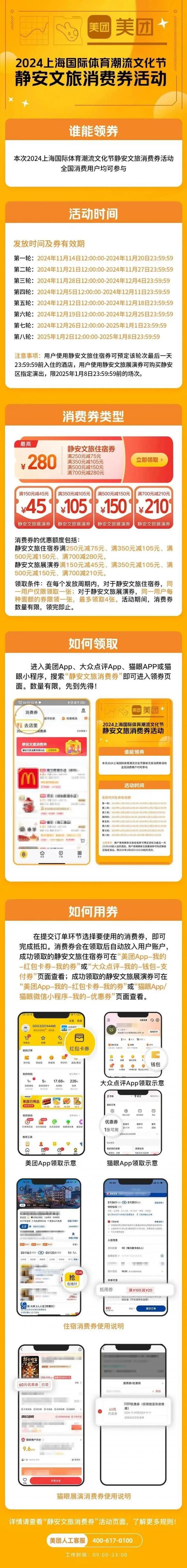 自 11 月 14 日起,每周发放体育潮流文化节文化旅游券,不少于 8 每周四中午有一个轮数 12 所有的点都将在美团 App、大众评价 App、猫眼 App 以及小程序的发放,全国各地的客户都可以领用。本次活动包括住宿和展览表演两个领域,即静安文化旅游住宿券和汇演券,涵盖 245 酒店包括汉庭、全季等连锁酒店,以及宝格丽、马勒别墅、阿丽拉、普丽等高端酒店品牌;覆盖 15 一个表演,一个展览场地, 80 项目展示商品,不仅包括经久不衰的驻场表演《不眠之夜》 Sleep No More》、ERA 时空之旅 2 等等,还有脱口秀、元宇宙展览等热点内容。