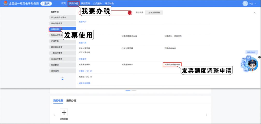 登陆电子税务局,在首页依次点击【我要办税】-【发票使用】-【发票额度调整申请】进入功能页面。