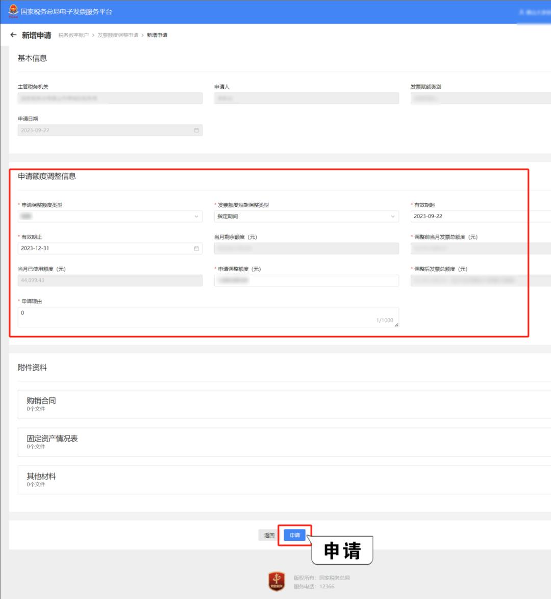点击“新增申请”按钮,填写“申请调整金额类型”“申请调整金额”“申请理由”等信息,上传相关附件信息,提交“申请”。