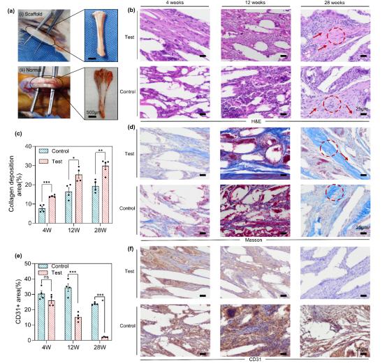 最后,研究人员建立了兔子全层肌腱损伤模型,将MBT支架缝合到肌腱缺陷处,进一步评估了MBT支架促进肌腱再生的作用。实验结果表明,MBT支架可以促进肌腱在早期康复过程中的再生;与对照组相比,实验组有更密集的胶原蛋白沉积,呈现类似于实际组织的波纹结构;而在12周内,实验组的CD31更少。 该地区表明炎症细胞和血管减少,具有较好的修复效果。与对照组相比,MBT支架在促进筋腱缺损快速再生方面具有较好的效果。