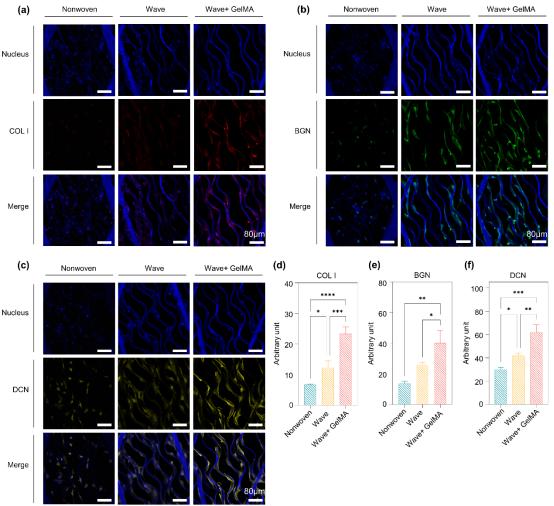 不仅如此,研究人员还验证了MBT支架可以显著促进体外TSPCs的一型胶原蛋白、BGN和DCN功能表达,这证明了多尺度仿生支架在体外构建筋腱ECM中的有效性,对于进一步作为组织替代品的应用具有重要意义(图5)。