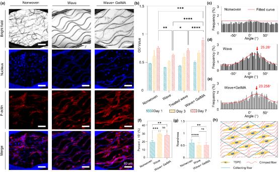 研究人员发现,MBT支架的波纹结构可以诱导筋腱干细胞延卷结构的生长,这表明波纹结构微细胞可以增强拓扑引导,诱导细胞在体外构建类似于体内的卷曲结构。并通过CCK8试验,研究人员还验证了纳米Shish-Kebab结构和GelMA水凝胶可以显著促进细胞粘附和增殖,从而进一步改善TSPCs功能和组织重塑(图4)。