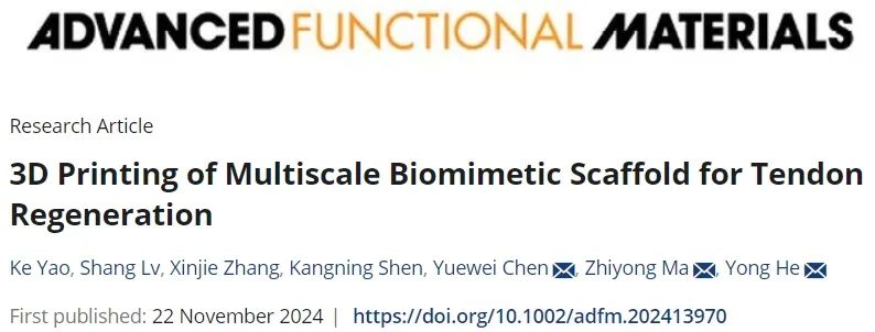 有关研究采用“3D” Printing of Multiscale Biomimetic Scaffold for Tendon Regeneration“问题发表在Advanced上 Functional Materials。浙江大学贺永教授、湖州师范大学马志勇副教授、贵州大学陈跃威副教授是姚克博士、吕尚博士、张新杰博士,他们是共同通讯论文的作者。