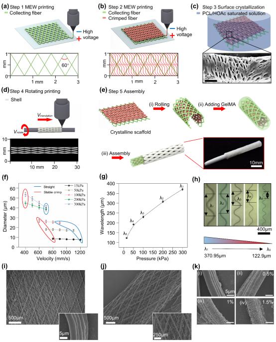 研究人员首先选择MEW技术来打印和收集纤维和卷曲纤维层(图2)(a)(b))。作为第二层卷曲纤维收集的基础,采集纤维直径为40-60um。采集纤维被设计成复制筋腱胶原纤维的螺旋结构,在轴向张力下提供结构支撑和吸收变形。用于模拟胶原纤维波浪结构的卷曲纤维直径为5-10um。接着,将支架浸入过饱和PCL/乙酸中(HOAc)引导纤维表面形成类似胶原纤维螺旋结构的纳米杂交Shish-Kebab结构(图2)(c))。随后,研究人员通过旋转印刷制备了多孔机壳,然后将收集和卷曲的纤维卷成管状,并加入GelMA水凝胶。最终,MBT支架是通过组装正式支架和外壳来建立的,如图2所示。(e)所示。