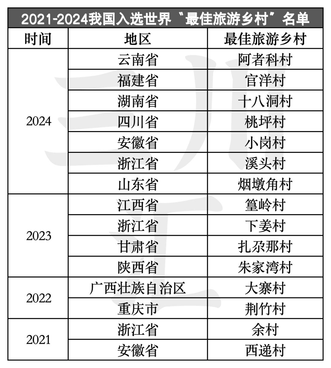 11月15日,“最佳旅游村”名单于2024年公布。中国申请了云南阿者科村、福建官洋村、湖南十八洞村、四川桃坪村、安徽小岗村、浙江溪头村、山东烟墩角村7个农村当选,成为今年当选人数最多的国家。