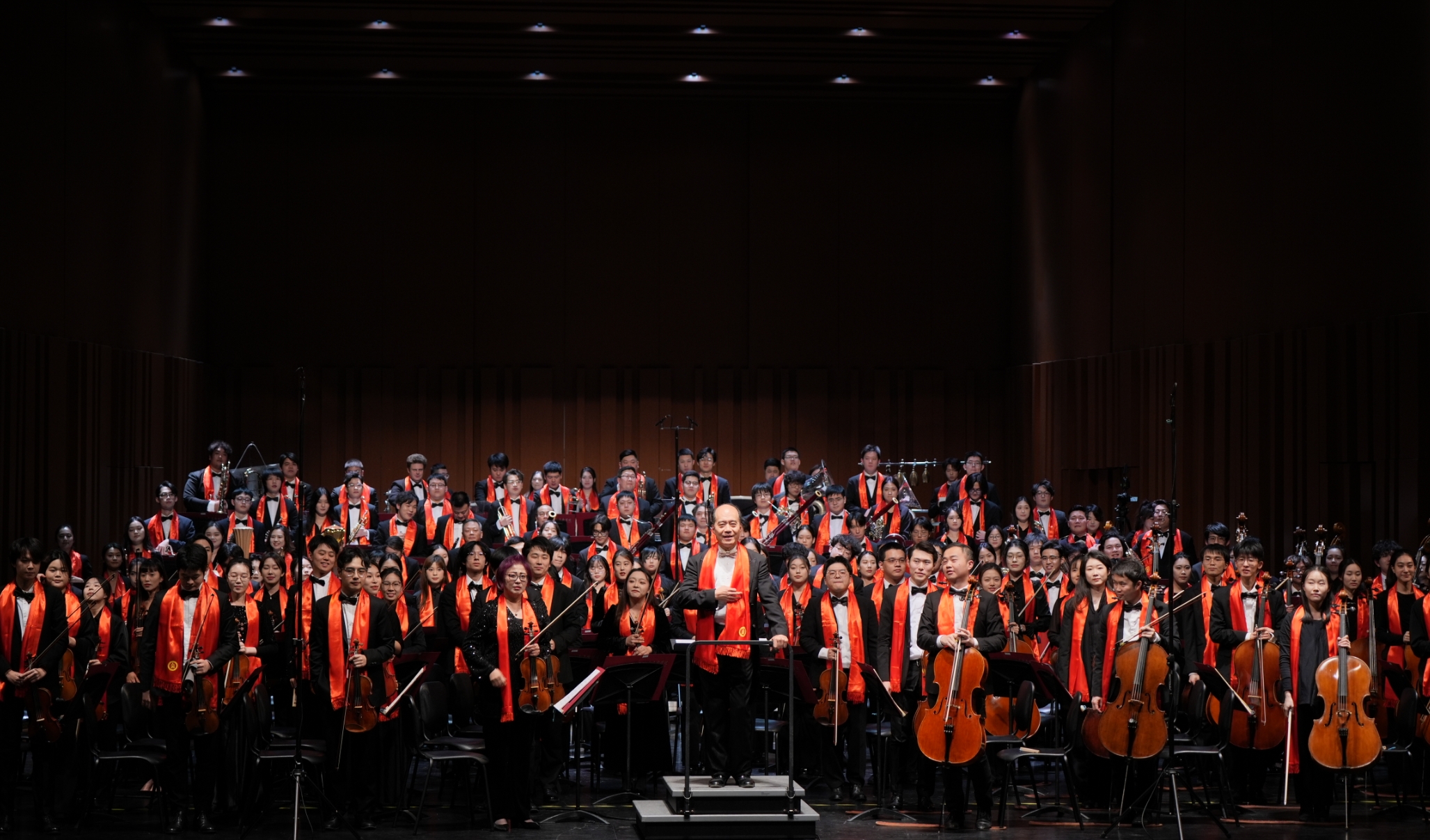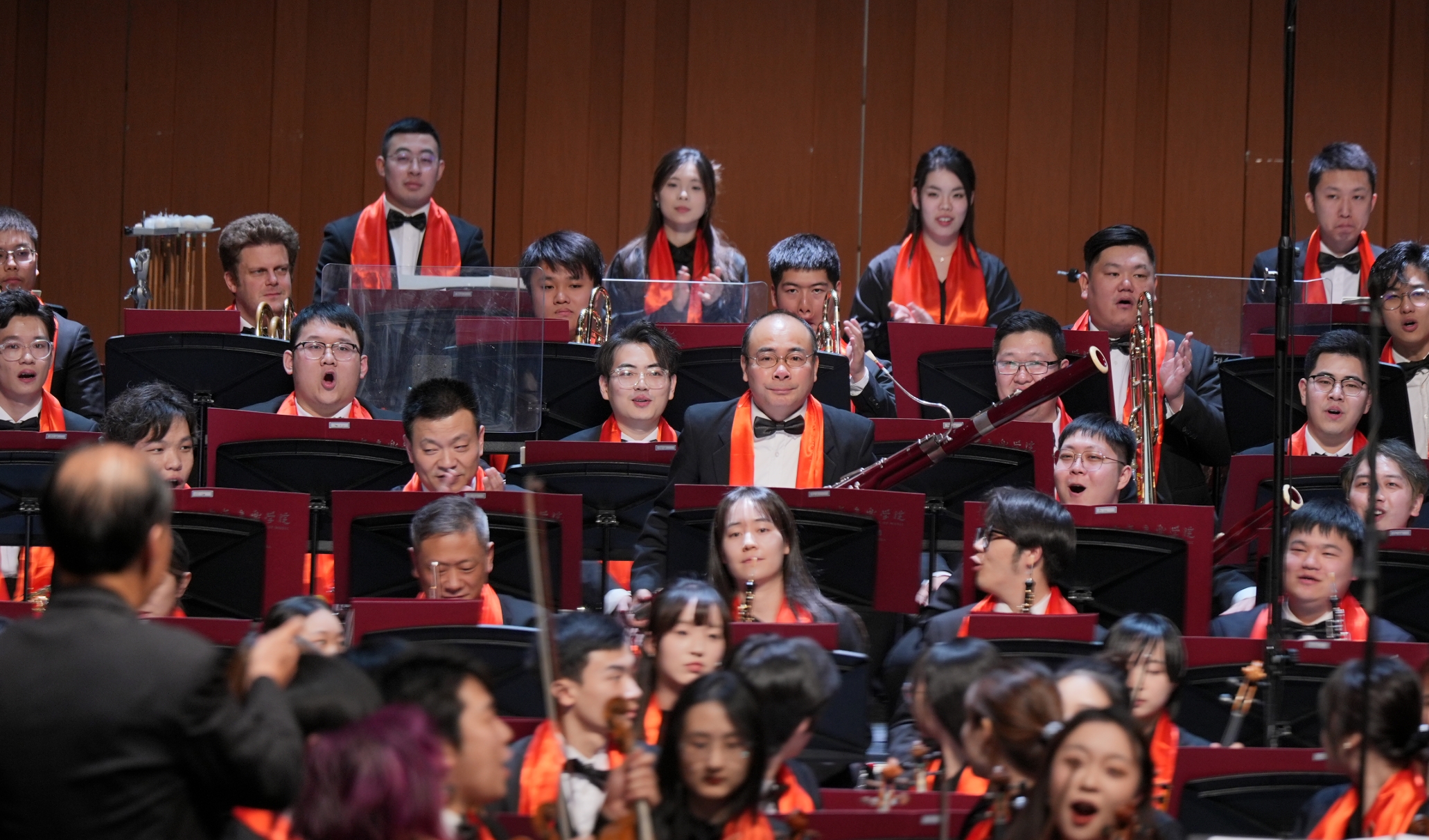 表演结束时,300多名上音师生和校内外表演者戴着代表节日喜庆的红色围巾,赠送了上音作曲家刘邈创作的《火车托卡塔》,庆祝上音97岁生日。