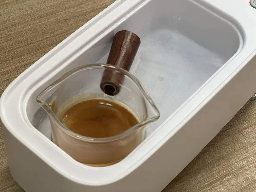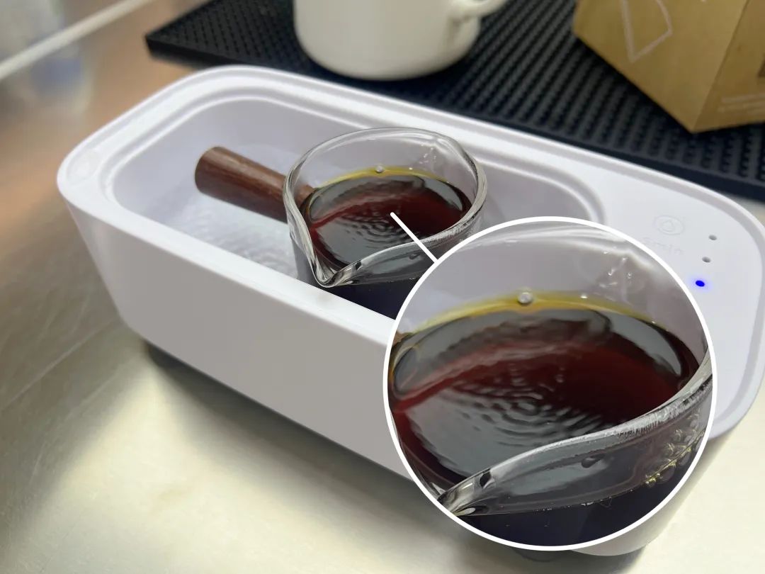 当我怀疑的时候,我发现了抖音、小红书等平台,许多专业咖啡师用超声做咖啡: 将提取好的咖啡液连水杯放入超声仪器中,经过一些振动,咖啡的味道和味道真的变了。