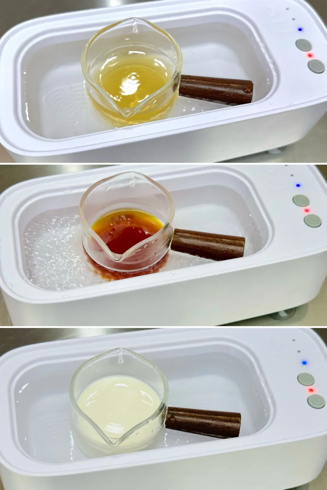 将冷茉莉绿茶和热滇红各自放入超声波仪器隔水振动,与未振动版相比,茶香略有减弱,涩味增强。 (不排除受取量影响)