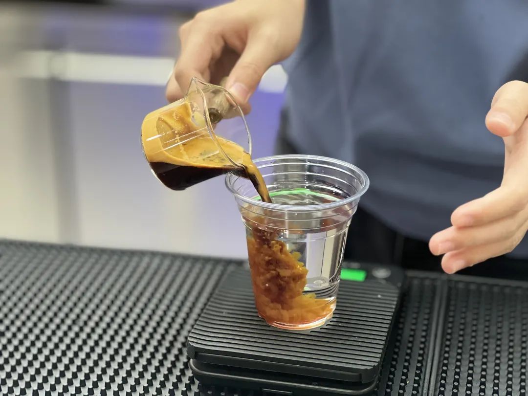 将经震动的浓缩按1:6比例加冰水做成冰美式,对比同样没有振动的冰美式。
