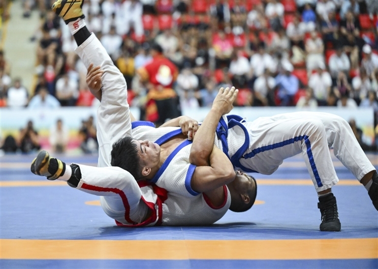 十一月二十七日,河北队选手王小文(上)和河北队选手伊德日阿尔斯在56公斤的绊跤决赛中停留。最终,王小文击败了伊德日阿尔斯楞,获得了一等奖。