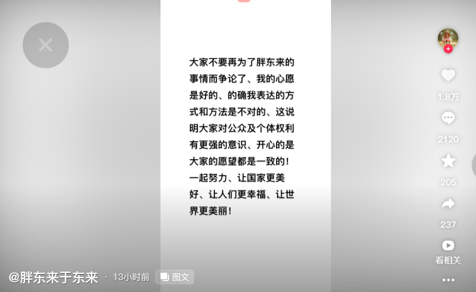 于东来回应彩礼争议:我的愿望是好的,表达方式是错误的。