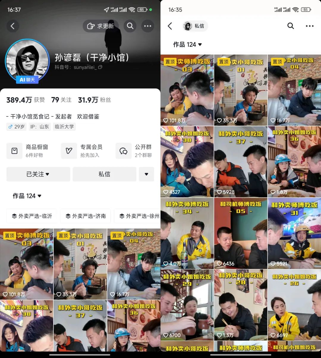 今年8月,@孙谚磊(干净的小博物馆)让送货员带他去吃一个干净的小博物馆,因为他给送货员100元钱。第一个视频获得了35万元 点赞,第三个点赞更是超过了100万。