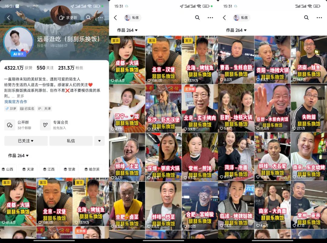 现在,@远哥逛逛 抖音粉丝总数已超过230万,近期视频点赞均在5~10万之间,爆款视频点赞可达138万,已成为快速崛起的餐饮探店创作者。