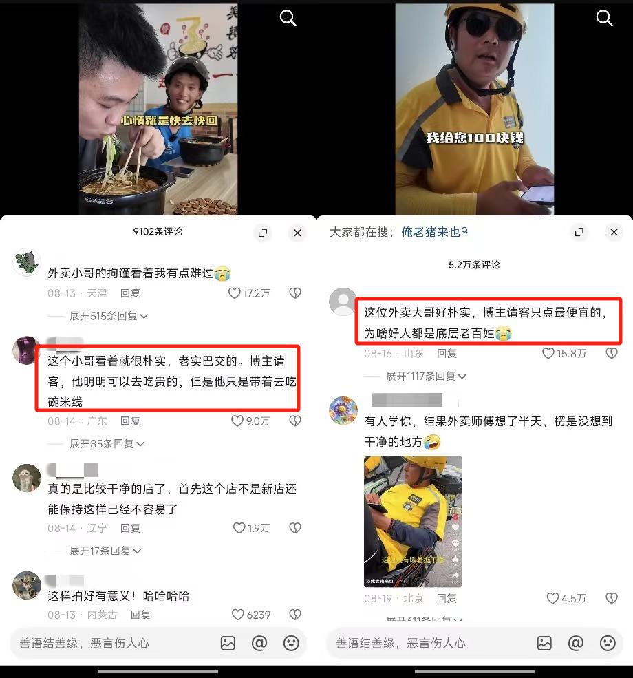 然而,这些生活相对尴尬、需要更多钱的送货员特别“诚实”。即使他们知道吃饭是创作者的礼物,他们中的大多数人只点最便宜的食物,这也引起了评论区大量网友的感受。