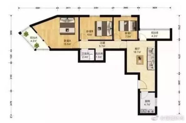 另外就是手枪户型:这类房型形状像一把手枪,而且缺角严重,而且这类房型向南切面太少,光照性能较差。