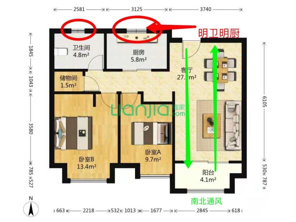 此外还有明厨明卫,厨房和卫生间最好都有窗户可以通风,一是通风可以去除异味,二是照相比较好。