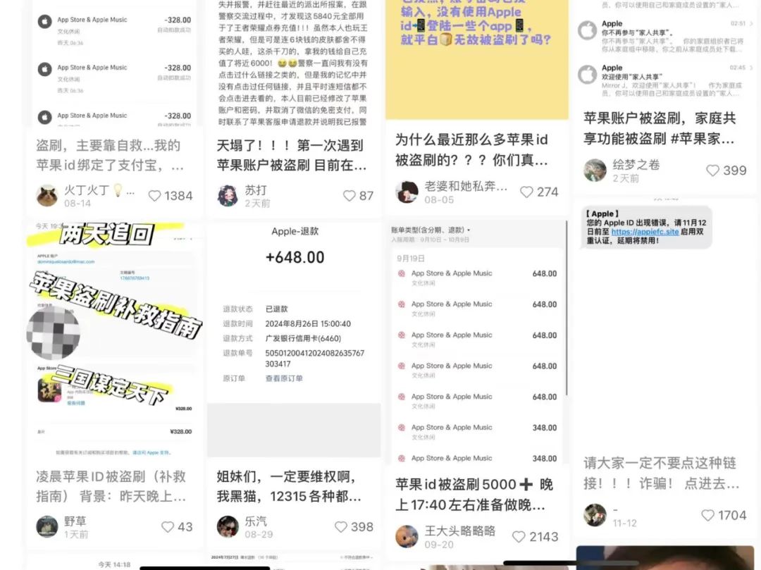 最近,许多苹果手机用户通过小红书等多种渠道反馈,他们的苹果ID被盗,然后他们的苹果ID绑定的支付宝免密账户被用于多种类型的在线消费。