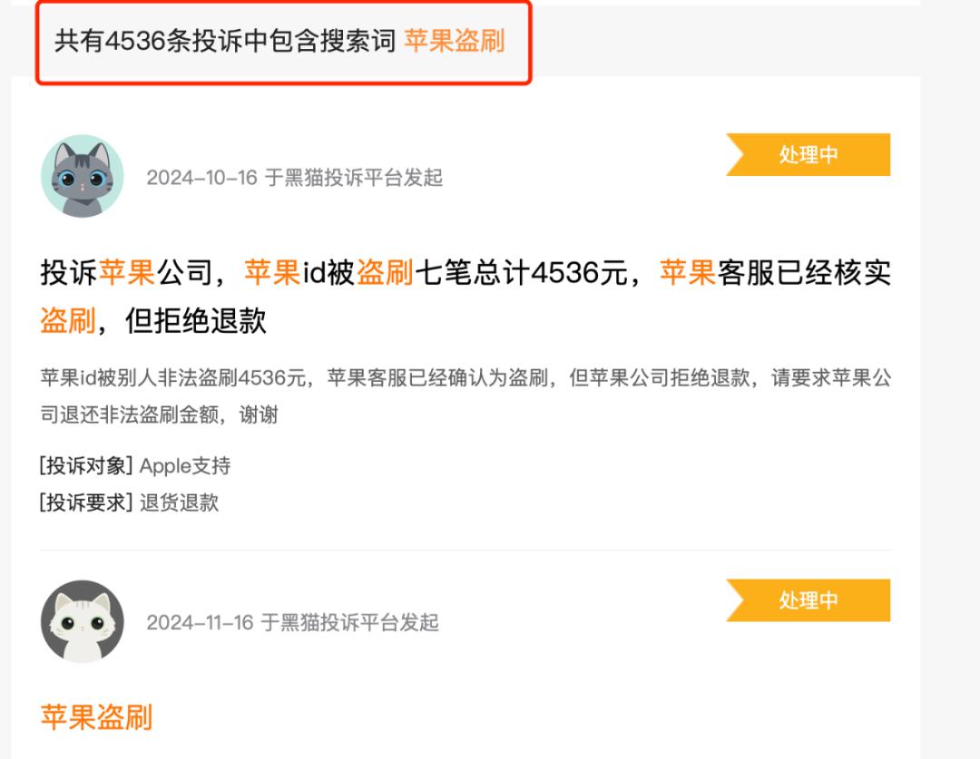 根据不完全统计,多个客户造成的人均财产损失达到数千元。「 商业秀」搜索黑猫投诉中的“苹果偷刷”,共有4536条相关投诉。