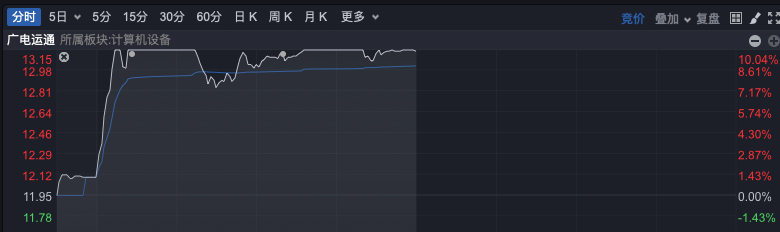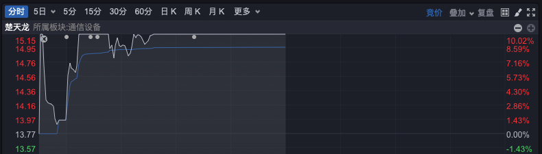 数字货币的概念在上午高开高走,板块指数一度直线上涨超过3%。广电运通、楚天龙都只用了6分钟左右的时间垂直涨停,旗天科技一度触及20%的涨停,国芯科技、长亮科技等涨幅居前。