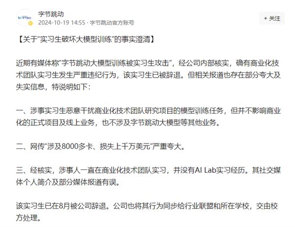 随后字节跳动发表声明,确定此事,并提及「正式项目和线上业务不影响商业化,也不涉及字节跳动大模型等相关业务。」