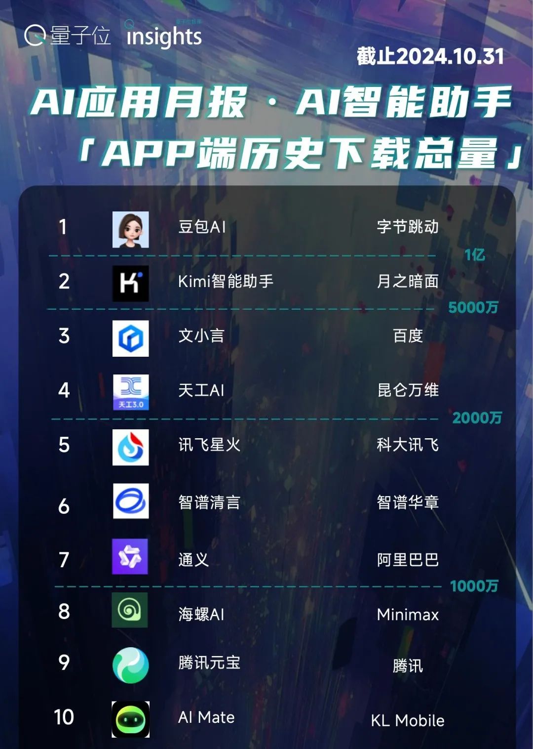其中,豆包历史累计下载量超过1亿,Kimi下载量超过5700万。