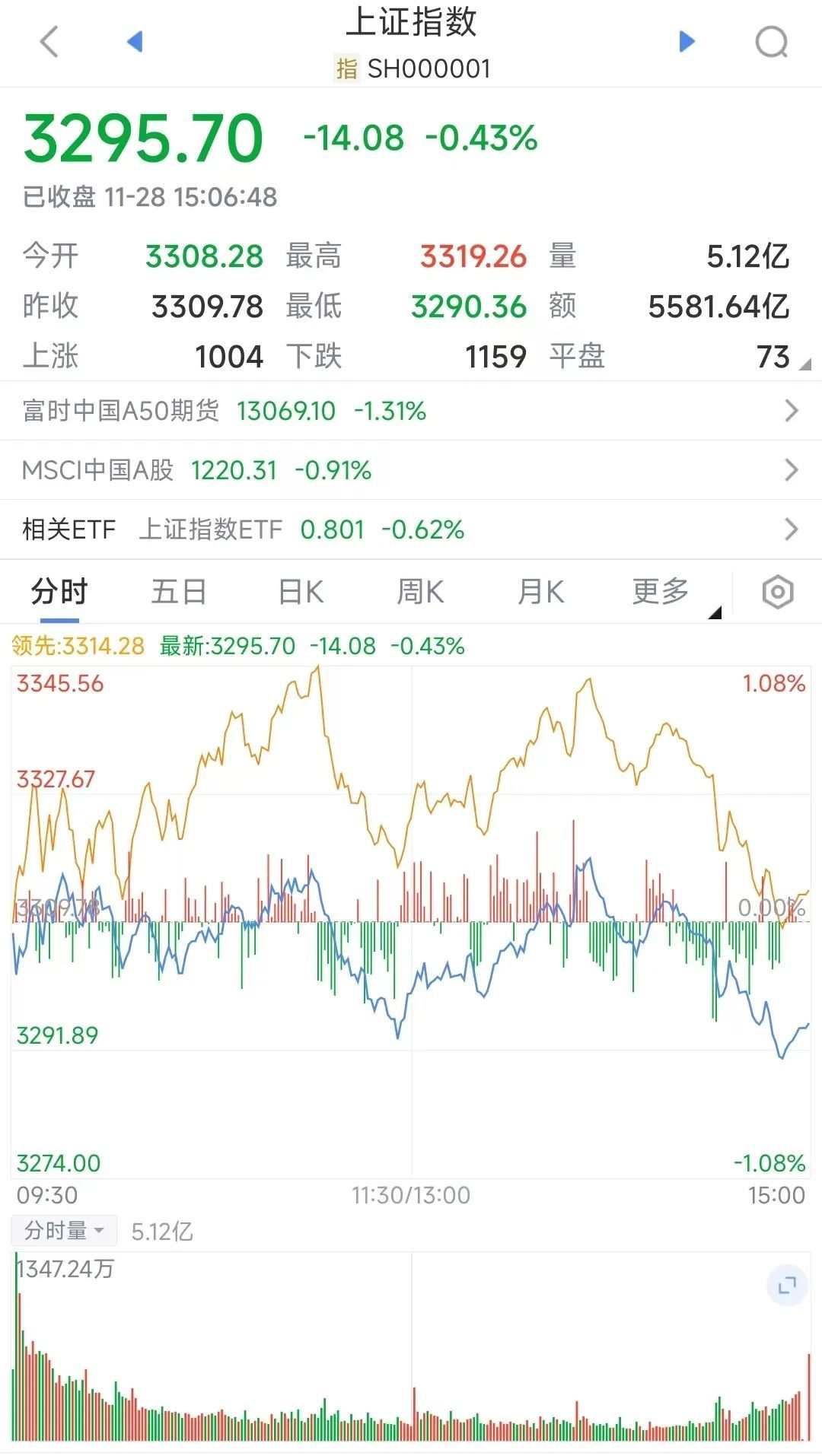 十一月二十八日,尾盘跳水,三大指数齐头并进,创业板指数下跌,上证指数下跌3300点。截至收盘,上证指数下跌0.43%,深成指下跌1.26%,创业板指数下跌1.76%。市场上超过2500只股票上涨,总成交额较上日增长381亿元。