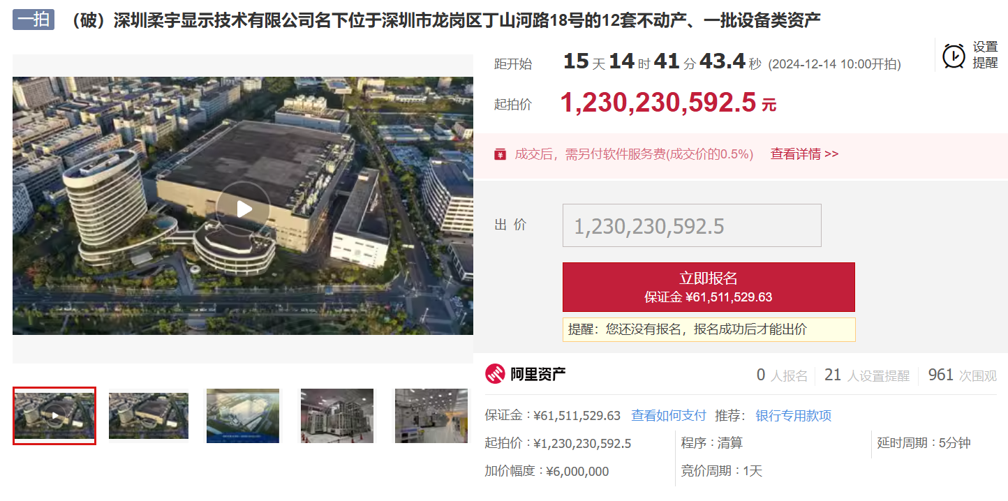 十一月二十八日,已经进入破产程序的深圳柔宇显示技术有限公司(以下简称“柔宇显示”)的资产被挂在阿里资产拍卖网上,起拍价约12.3亿元,将于12月14日10:00至2024年12月15日10:00(延迟除外)开拍。