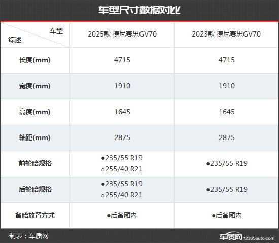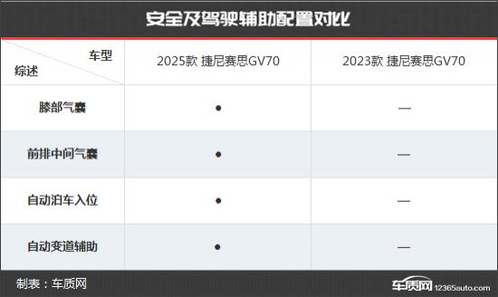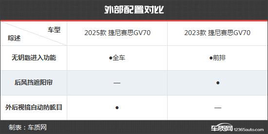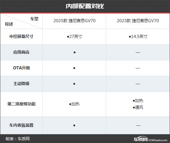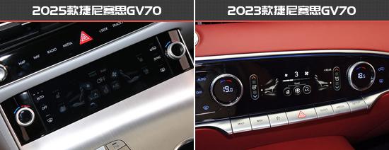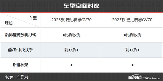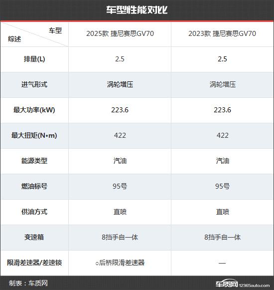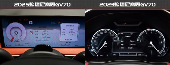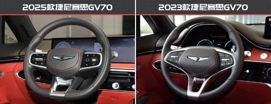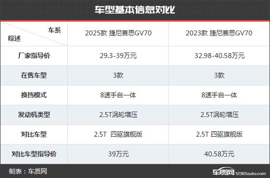 2025 款捷尼赛思 GV70 与老款相比,起步价和最高价都有所下降,但动力装置没有变化,仍然配备。 2.5T 发动机 8 速手自动变速箱的搭配。为直观地看到新旧车型的变化,本文选择了新旧车型的顶级车型进行对比。