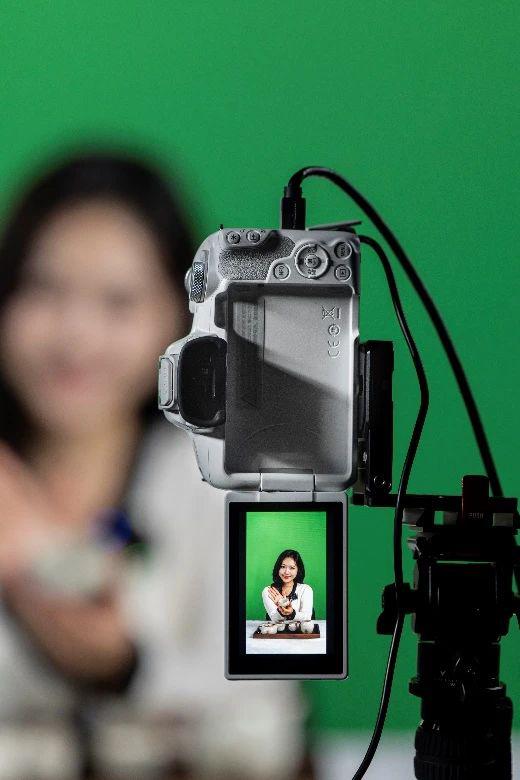 建议在低成本绿幕直播间使用佳能。 EOS R50 作为主机位置。其出色的画质和动态范围,能够真实再现人物和产品的色彩,提升直播视觉效果。组合 RF35mm F1.8 MACRO IS STM 定焦镜头,顾客可以减少变形和压缩空间,同时增强画面层次感,大光圈有助于突出主题,营造电影质感。
