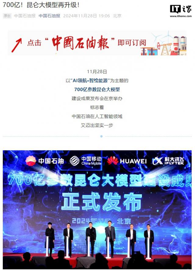 IT 世家 11 月 29 据《中国石油报》报道,11 月 28 日,以" AI 领航・智绘能源"为主题的 700 一亿参数昆仑大模型建设成果发布会在北京举行。在新闻发布会上,中国石油介绍了与中国移动、华为和科大讯飞联合打造的 700 一亿参数昆仑大模型,展示 43 专业应用和通用应用创新场景。