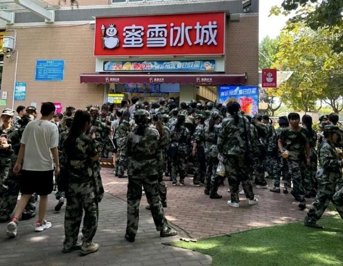 在校园里,有的奶茶店还重温了久违的热闹。军训期间,校园内的蜜雪冰城就总被“新兵”攻陷。结束训练的大学新生,一齐奔向雪王怀抱,下一刻店员马上开启全功率模式制作冰淇淋和奶茶,把机器干到冒烟。