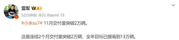 小米SU7 十一月份交付量超过2万辆 全年交付冲刺13万台